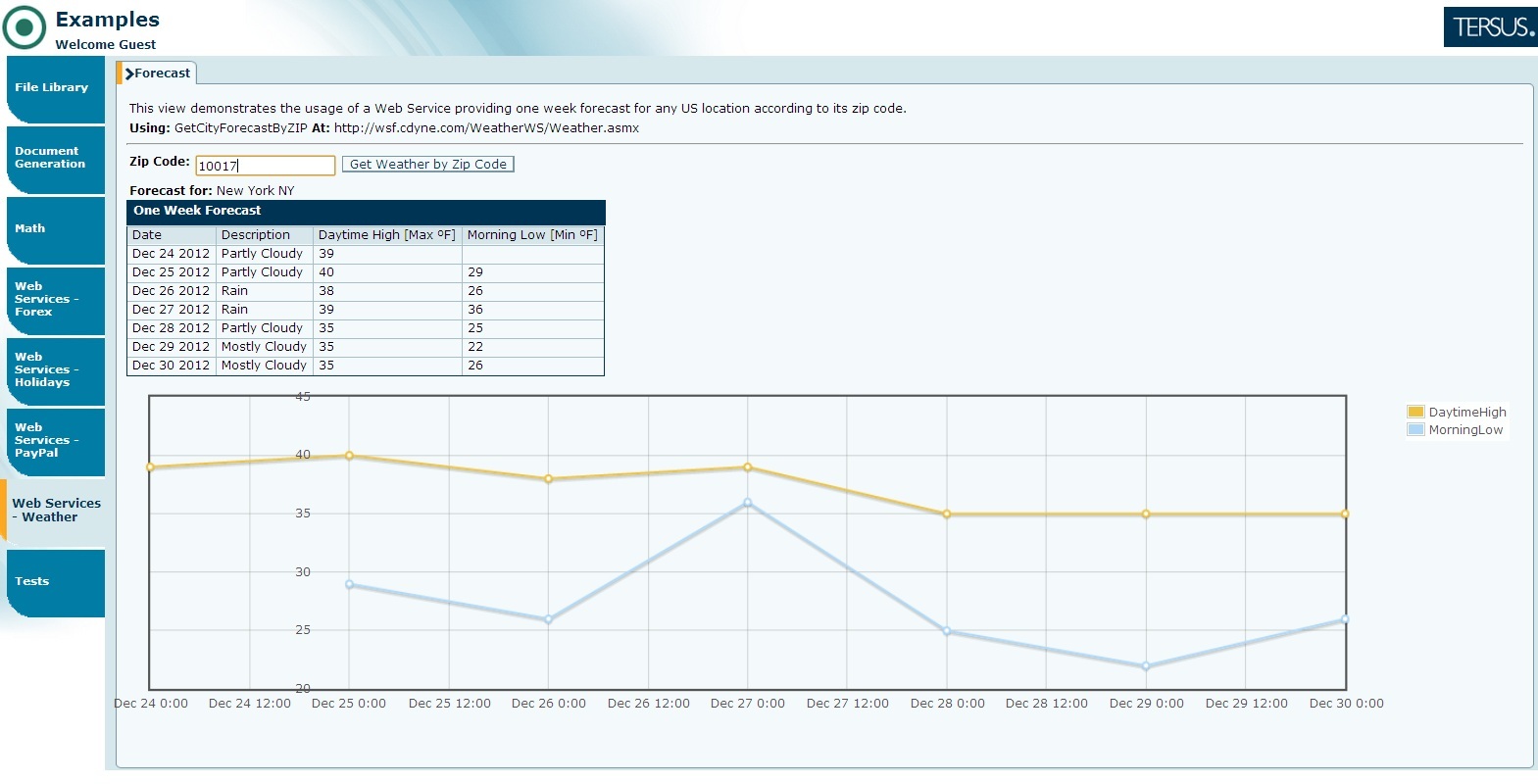 Demonstrates the usage of a Web Service providing one week forecast for any US location according to its zip code.