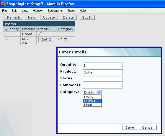 The wizard has used the mechanism of user defined data types with valid values, and then created a Chooser filed using the user defined data type. If you start the application, you will see that the Category field is represented by a drop-down list that lets the user choose one of the 3 values we have specified (Dairy, Drinks or Meat).
