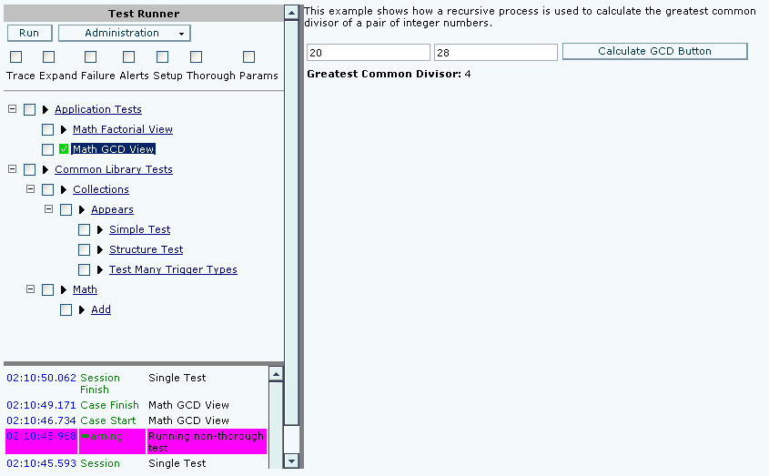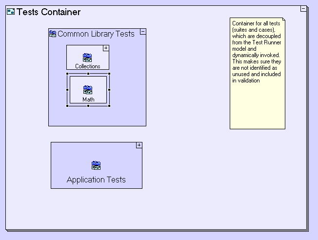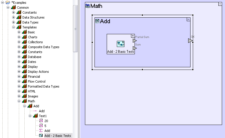If you now save you model and run Examples, you'll see that there is a new branch 'Math' under the 'Common Library Tests' suite of tests. You can mark the 'Add' test case and run it.