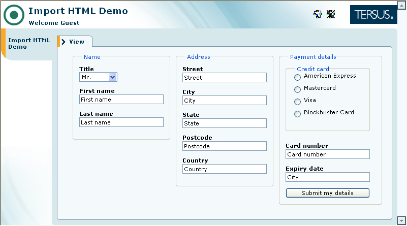 As an example, we shall identify the First name and Last name input fields, as well as the Submit my details button, by adding the Tersus-specific attribute element_name to the relevant tags in the form - as follows: