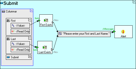 To finish off our demonstration, we shall model a process that checks, when the Submit my details Button is pressed, whether the First Name and Last Name have been entered, and alerts the user if at least one of them is missing: