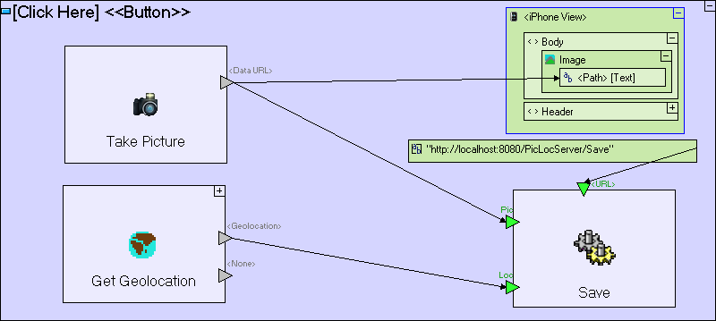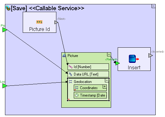 Other than the Take Picture and Get Geolocation templates, I'd like to call your attention to the special method by which the callable service is called, using a Service having the same triggers as the actual callable service (Pic and Loc in this case), with no modeling inside (the modeling is in the server-side application), and with a special <URL>, which should point to the callable service (you'll need to change the localhost and possibly the port number as well to point at the correct host and port running your server side application.