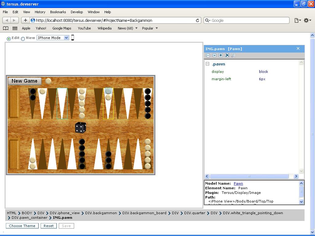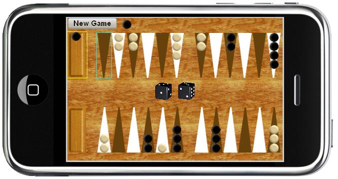 /** The whole screen (320x480 pixels) **/.backgammon /** Used by "<iPhone View>/Body" **/{margin:3px;background:transparent url(bg.png) repeat scroll; /** Brown wood-like image, 320x480 pixels **/height:314px; /** As we have a margin of 3 pixels, we are left with net height 314 **/width:474px; /** As we have a margin of 3 pixels, we are left with net width 474 **/}/** The board itself **/.backgammon_board /** Used by "<iPhone View>/Body/Board" **/{margin-top:6px;height:264px;}/** The control row above the board itself **/.game_control_row /** Used by "<iPhone View>/Body/Control Row" **/{display:inline;}/** A container for a single pawn to indicate the color of the current player **/.player_indication /** Used by "<iPhone View>/Body/Control Row/Player" **/{margin-right:11px;vertical-align:top;margin-top:4px;display:inline-block;}/** A status message (e.g. victory announcement) **/.message /** Used by "<iPhone View>/Body/Control Row/Message" **/{color:White;font-size: 14px;vertical-align:middle;}/** Each of the "out" areas at the leftmost part of the board **/.out_area /** Used by Used by "<iPhone View>/Body/Board/Top/Top Out" and "<iPhone View>/Body/Board/Bottom/Bottom Out" **/{height:102px; /** Same height as "quarter" (see below) **/display:inline-block;}/** Point 0 - the black's "out" point (inside the top out area) **/.out_top /** Used by "<iPhone View>/Body/Board/Top/Top Out/Point 0" **/{background:transparent url(Points/brown-rectangle-up.png) no-repeat scroll;height:102px; /** The full height of "out_area" **/width:40px;display:inline-block;position:relative;padding-left:3px;}/** Point 25 - the white's "out" point (inside the bottom out area) **/.out_bottom /** Used by "<iPhone View>/Body/Board/Bottom/Bottom Out/Point 25" **/{background:transparent url(Points/brown-rectangle-down.png) no-repeat scroll;height:102px; /** The full height of "out_area" **/width:40px;display:inline-block;position:relative;padding-left:3px;}/** A quarter of the board (6 consecutive points) **/.quarter /** Used by each of the "Top Left", "Top Right", "Bottom Left" and "Bottom Right" panes **/{height:102px;display:inline-block;margin-left:22px; /** Separation between "out" area and first 6 points, and between first 6 point and next 6 points **/ }/** Container for dice images (a horizontal area between the top half of the board and the bottom half of the board) **/.dice_pane /** Used by "<iPhone View>/Body/Board/Dice" **/{height:60px;margin-left:auto;margin-right:auto;display:table;}/** A single die image **/.die /** Used by "<iPhone View>/Body/Board/Dice/Die" **/{width:50px;margin-top:5px;}/** A point at the top half of the board whose background is a white triangle **/.white_triangle_pointing_down /** Used by top points with even numbers */{background:transparent url(Points/white.png) no-repeat scroll;height:100px;width:32px;display:inline-block;position:relative;}/** A point at the top half of the board whose background is a brown triangle **/.brown_triangle_pointing_down /** Used by top points with odd numbers */{background:transparent url(Points/brown.png) no-repeat scroll;height:100px;width:32px;display:inline-block;position:relative;}/** A point at the bottom half of the board whose background is a white triangle **/.white_triangle /** Used by bottom points with even numbers */{background:transparent url(Points/white-up.png) no-repeat scroll;height:100px;width:32px;display:inline-block;position:relative;}/** A point at the bottom half of the board whose background is a brown triangle **/.brown_triangle /** Used by bottom points with odd numbers */{background:transparent url(Points/brown-up.png) no-repeat scroll;height:100px;width:32px;display:inline-block;position:relative;}/** Container for pawn images in a top point **/.pawn_container /** Used by "Pawns" within top points **/{position:absolute;top:0px;}/** Container for pawn images in a bottom point **/.pawn_container_growing_up /** Used by "Pawns" within bottom points **/{position:absolute;display:inline-block;bottom:0px;}/** A single pawn image **/.pawn /** Use by "Point" for points 1 through 24 **/{display:block;margin-left:6px;}
