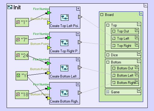 Board contains an Init process that initializes the CSS styles of the 24 points in the board (but not yet the game model, which is initialized each time the new Game button is pressed):