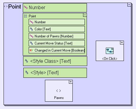 The <On Click> process within the Point model starts with In Turn?. If it returns Before Move, we invoke Immediate Marking as Source (surrounding the clicked point by a yellow line) and then Set Source If Legal (if the selected point is a legal source given the dice results, setting it as the source of the current move and setting all possible target points accordingly). If In Turn? returns In Move, we invoke Make Move if Legal (if the selected point is one of the possible target points, making the move).