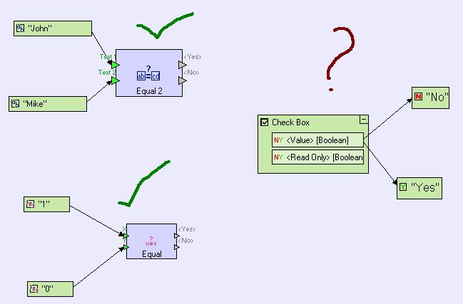 I can chek two strings equality and i can check two numbers equality, but how may i check Radiobutton is true or false or CheckBox? There is cheking functions for numeric and strings but there is no conditions for Booleans
