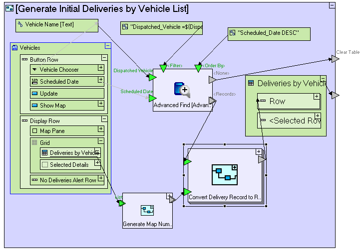 The initial reason that it does nothing as modeled is that Generate Map Numbers will not run - this is because when the Generate Initial Deliveries by Vehicle List process starts, the table (in the display) has no rows which means the flow from the Vehicles ancestor reference to the Generate Map Numbers will not occur.