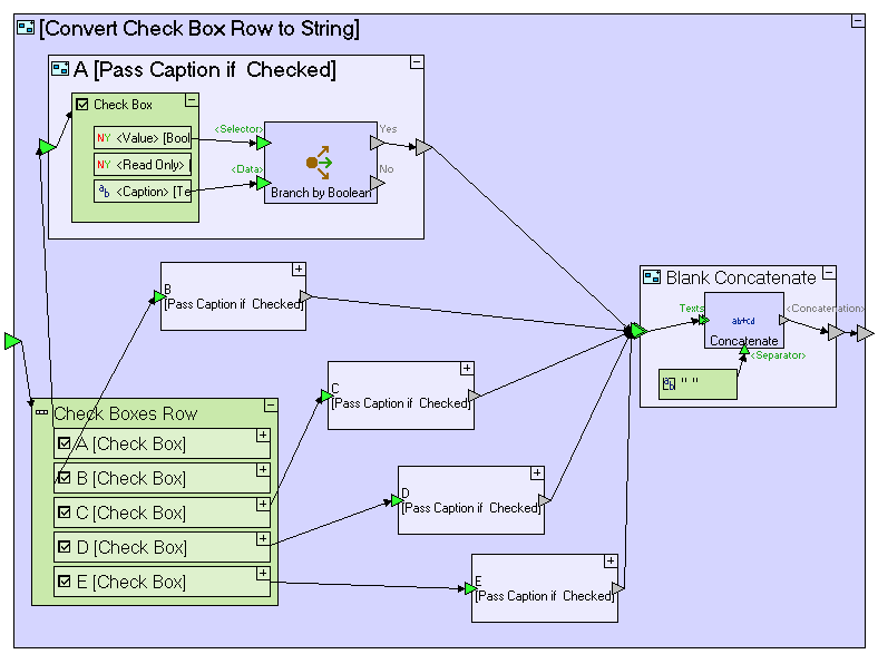 Also note this is just one possible implementation, and not necessarily the best one. For instance it's not a good implementation if you need to handle a variable number of checkboxes, but I think it's relatively easy to understand, and as you improve your understanding of and gain experience with Tersus, you may realize other implementations are better suited to your needs.