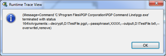(Message=Command 'C:\Program Files\PGP Corporation\PGP Command Line\pgp.exe' terminated with status 164\nArguments:--decrypt\,D:\TestFile.pgp\,--passphrase\,XXXX\,--output\,D:\TestFile.txt\,--overwrite\,remove)