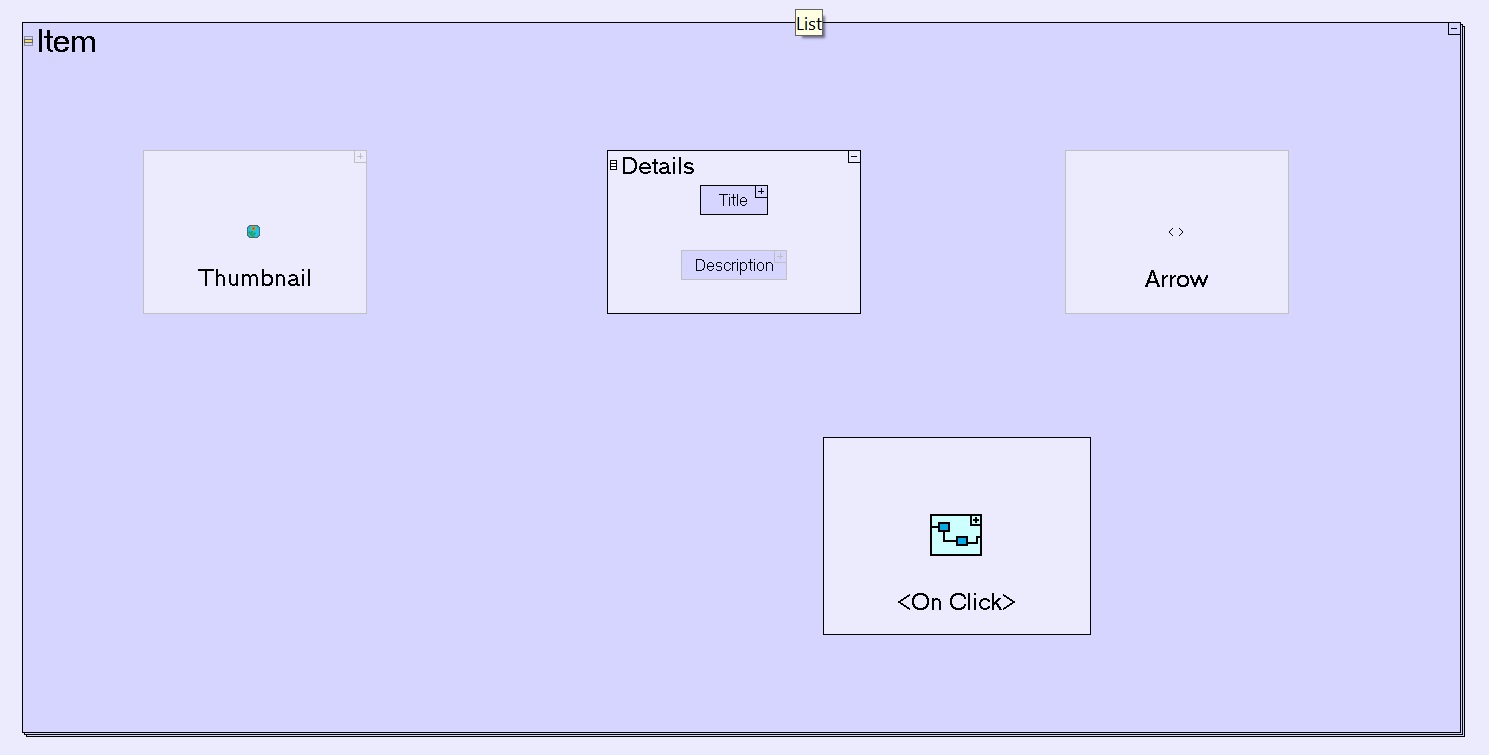 - Thumbnail - The item's icon (an Image) [note that by default this element has a grey border, indicating it is not created unless initiated by some flow into it; to change this behavior, right click the element and check its Always Create property.]