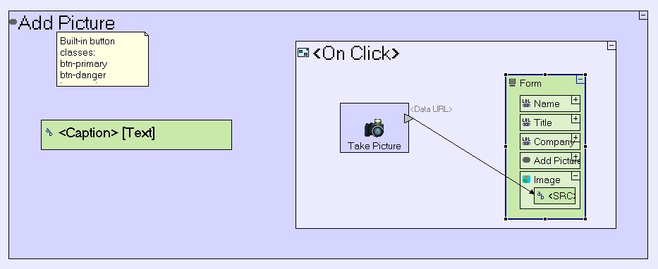 It returns the URL of the taken picture (through its <Data URL> exit).