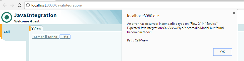Log:ERROR 2017-05-09 21:32:12,403 [http-nio-8080-exec-7] Request ID:20170509-21:32:12:399 [http-nio-8080-exec-7] Servlet Path:/Service Request URL:http://localhost:8080/JavaIntegration/Service Process Type:Service Base Model Id:JavaIntegration/Call/View/View Process Path:Pojo/Service Process Model Id:JavaIntegration/Call/View/Pojo/Service/Service Incompatible type on "Flow 2" in "Service". Expected JavaIntegration/Call/View/Pojo/br.com.din.Model but found br.com.din.Model at tersus.runtime.LinkHandler.handleValue(LinkHandler.java:108) at tersus.runtime.LinkHandler.invoke(LinkHandler.java:86) at tersus.runtime.FlowElementHandler.invokeLinks(FlowElementHandler.java:60) at tersus.runtime.SubFlowHandler.invoke(SubFlowHandler.java:125) at tersus.runtime.CompositeFlowHandler.run(CompositeFlowHandler.java:152) at tersus.runtime.CompositeFlowHandler.start(CompositeFlowHandler.java:85) at tersus.runtime.FlowHandler.doStart(FlowHandler.java:119) at tersus.runtime.CompositeFlowHandler.doStart(CompositeFlowHandler.java:295) at tersus.runtime.RuntimeContext.runProcess(RuntimeContext.java:1496) at tersus.webapp.Engine.callService(Engine.java:1193) at tersus.webapp.Engine.handleJavascriptRequest(Engine.java:1020) at tersus.webapp.Engine.handleRequest(Engine.java:210) at tersus.webapp.Engine.doPost(Engine.java:164) at javax.servlet.http.HttpServlet.service(HttpServlet.java:647) at tersus.webapp.Engine.service(Engine.java:1430) at javax.servlet.http.HttpServlet.service(HttpServlet.java:728) at org.apache.catalina.core.ApplicationFilterChain.internalDoFilter(ApplicationFilterChain.java:305) at org.apache.catalina.core.ApplicationFilterChain.doFilter(ApplicationFilterChain.java:210) at tersus.webapp.ServiceFilter.doFilter(ServiceFilter.java:101) at org.apache.catalina.core.ApplicationFilterChain.internalDoFilter(ApplicationFilterChain.java:243) at org.apache.catalina.core.ApplicationFilterChain.doFilter(ApplicationFilterChain.java:210) at org.apache.catalina.core.StandardWrapperValve.invoke(StandardWrapperValve.java:222) at org.apache.catalina.core.StandardContextValve.invoke(StandardContextValve.java:123) at org.apache.catalina.authenticator.AuthenticatorBase.invoke(AuthenticatorBase.java:502) at org.apache.catalina.authenticator.AuthenticatorBase.invoke(AuthenticatorBase.java:502) at org.apache.catalina.core.StandardHostValve.invoke(StandardHostValve.java:171) at org.apache.catalina.valves.ErrorReportValve.invoke(ErrorReportValve.java:99) at org.apache.catalina.core.StandardEngineValve.invoke(StandardEngineValve.java:118) at org.apache.catalina.connector.CoyoteAdapter.service(CoyoteAdapter.java:408) at org.apache.coyote.http11.AbstractHttp11Processor.process(AbstractHttp11Processor.java:1023) at org.apache.coyote.AbstractProtocol$AbstractConnectionHandler.process(AbstractProtocol.java:589) at org.apache.tomcat.util.net.NioEndpoint$SocketProcessor.run(NioEndpoint.java:1686) at java.util.concurrent.ThreadPoolExecutor.runWorker(Unknown Source) at java.util.concurrent.ThreadPoolExecutor$Worker.run(Unknown Source) at java.lang.Thread.run(Unknown Source) ERROR 2017-05-09 21:32:12,405 [http-nio-8080-exec-7] Error while executing process (type=/Service) Error Location:null