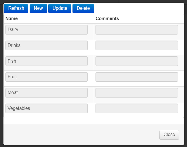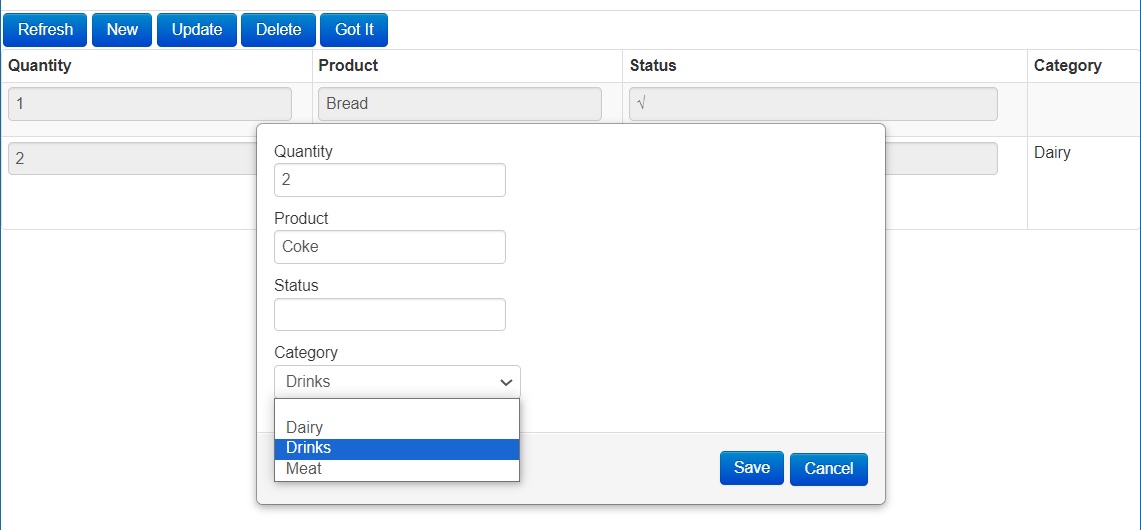 We will add a 'Category' column to the item table and show how we let the user select for each item a category from a list of categories managed in the system.